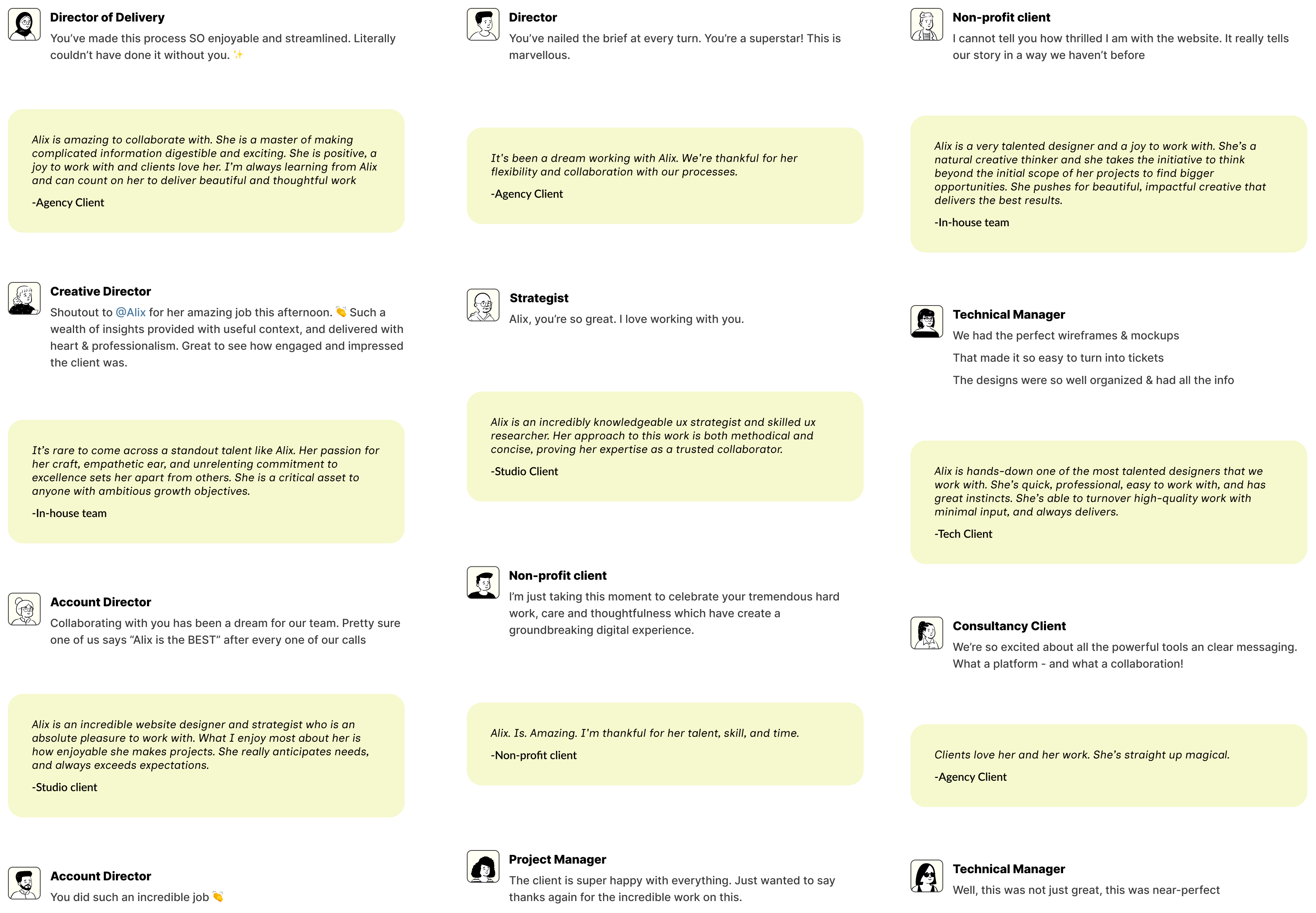I consider how to best support you, to meet you where you're at. I bring good vibes to meetings, listen, set expectations early, and communicate clearly. I've been told a few times by agencies that "clients love me", which reflects well on the agency. I strive to foster an inclusive and joyful space for the humans I work with.